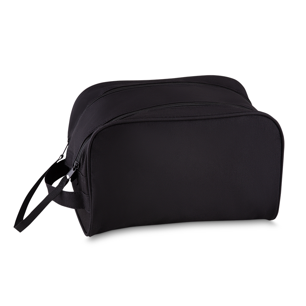 Nécessarie tecido poliéster 600D e detalhe em PVC,cursor duplo para fechamento com alça,trava com velcro,alça de mão,gravação Frontal.